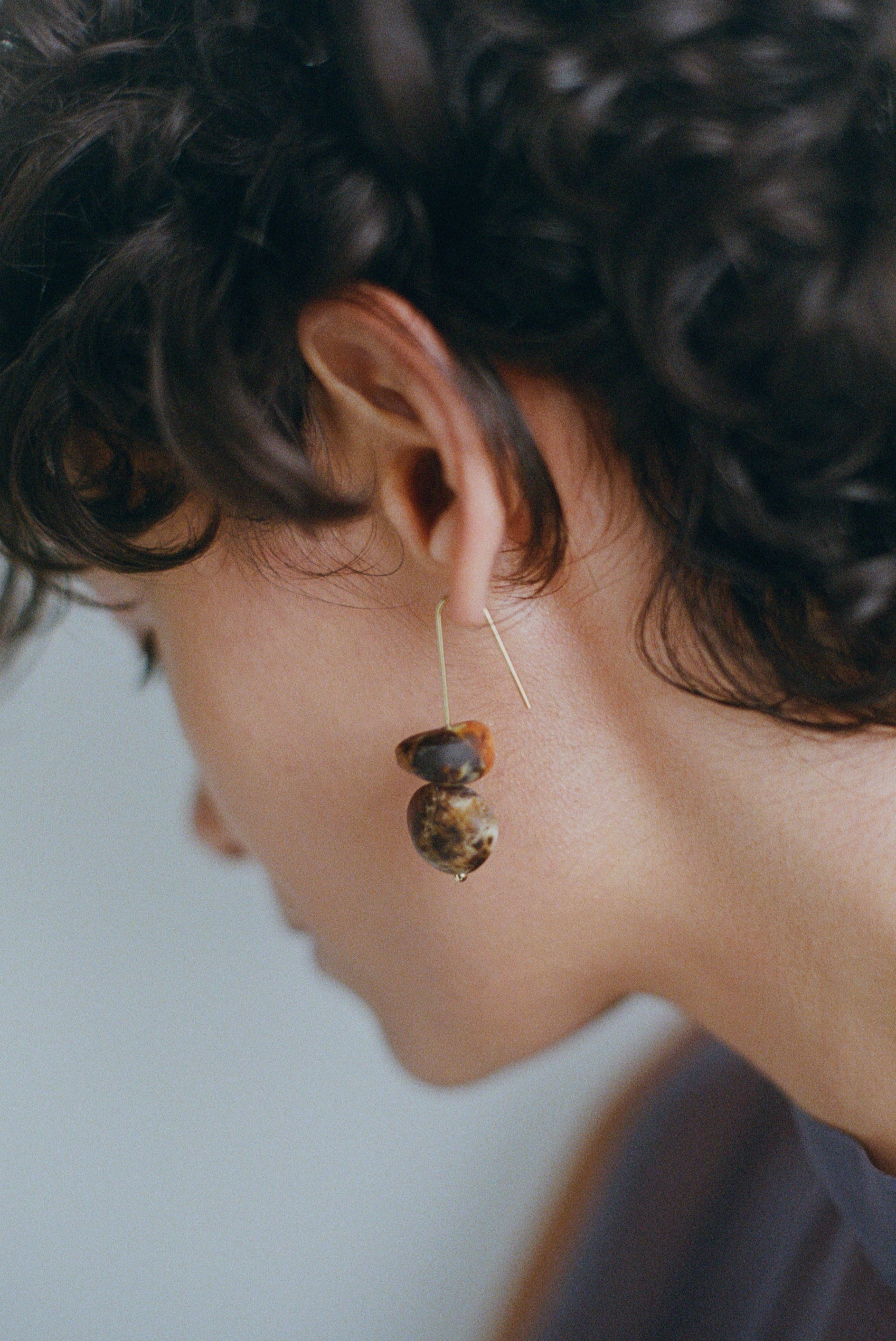 The Temple Earth Wire Earrings reflect the Earth's natural shapes and formations. Crafted from resin, their distinctive form resembles stacked pebbles. Featuring delicate wire and simple organic beads, they are exceptionally lightweight and comfortable to wear.