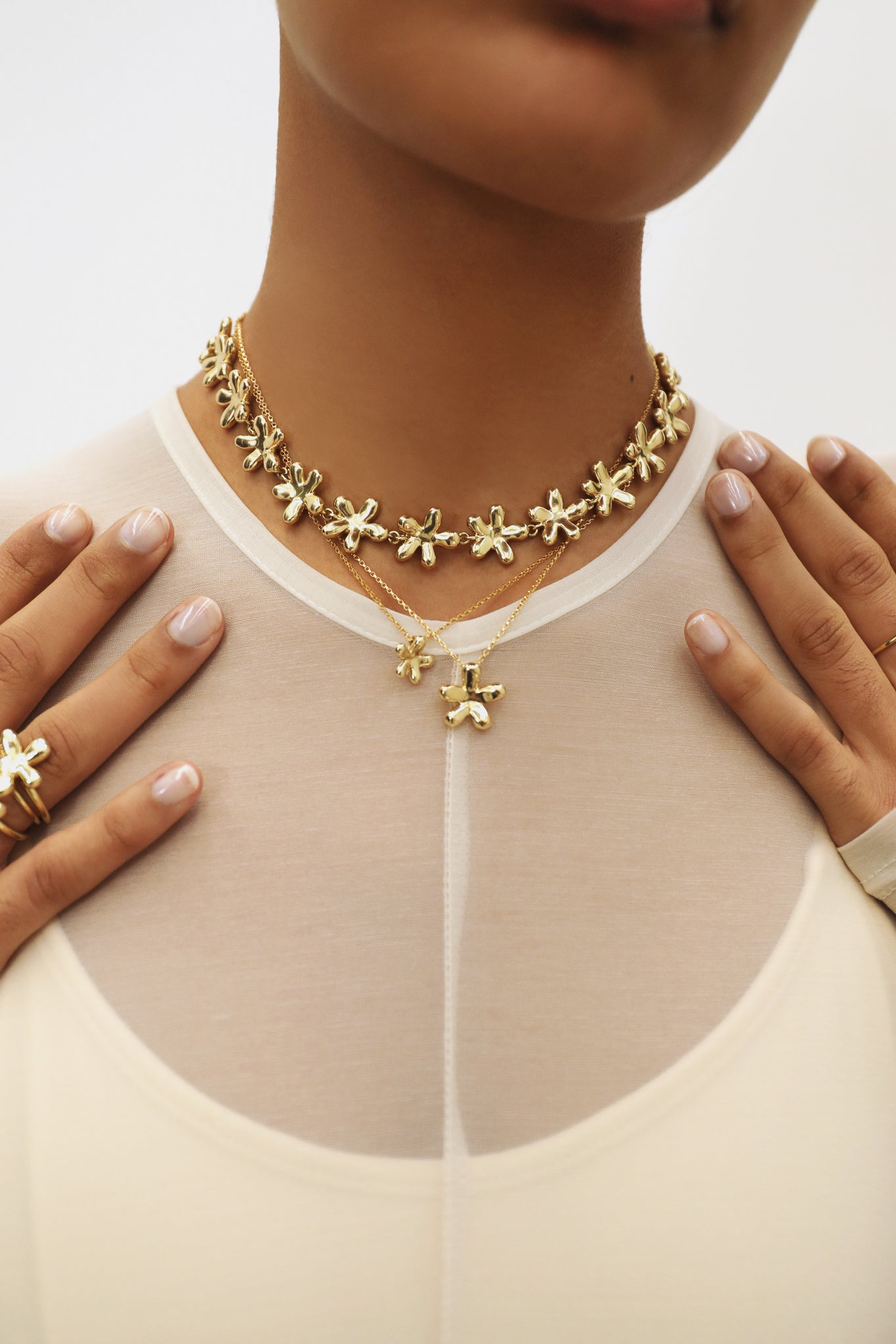 The Daisy Pendant showcases a daisy-shaped bead, in nano-coated brass. The daisy motif delicately threads a 14k gold-filled chain, with a brass DD logo tag at its tail end.