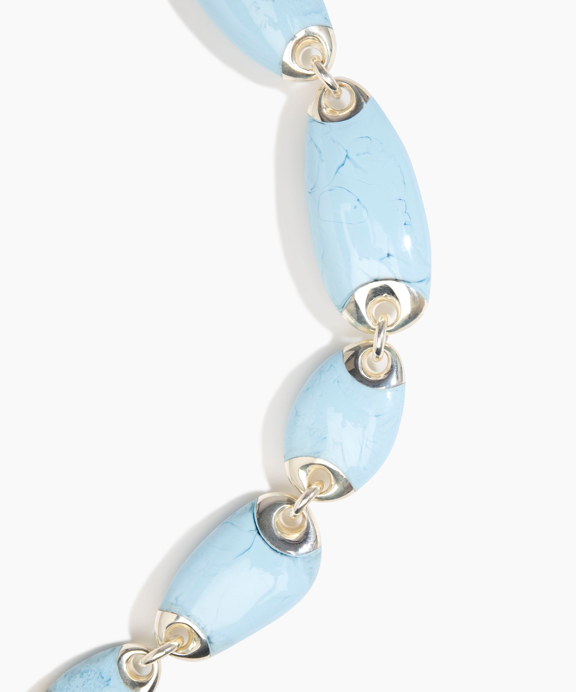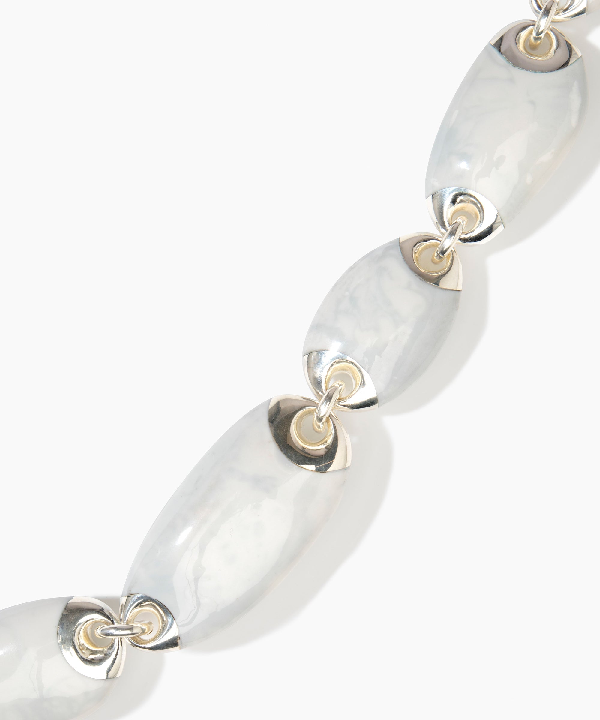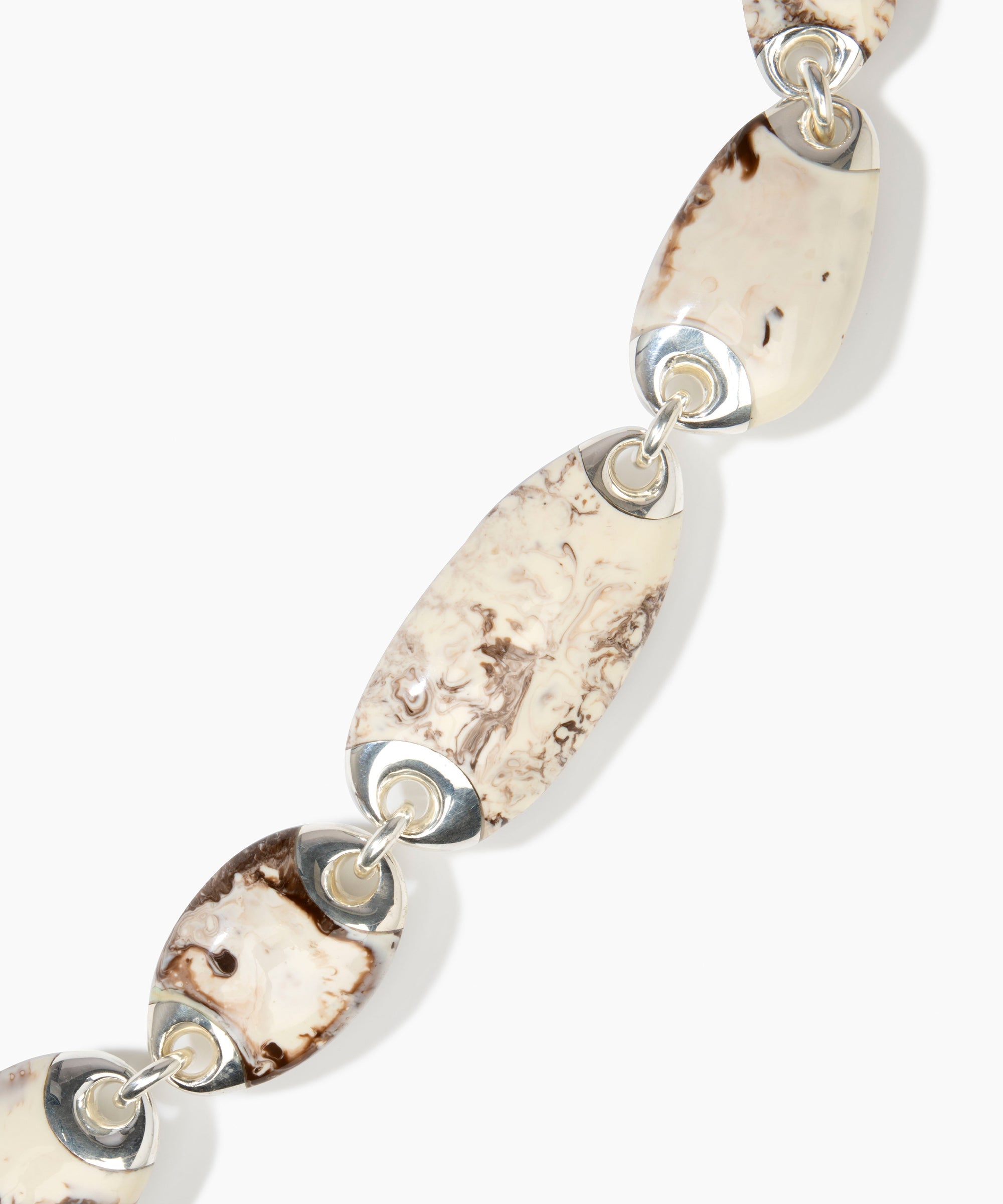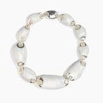 Referencing natural, geological forms, the Rock Chain Choker skilfully links varied organic resin beads, creating a bold necklace style that sits at the collar. Each of resin bead is framed with silver ends, creating a chainlink detail as one bead connects to another.