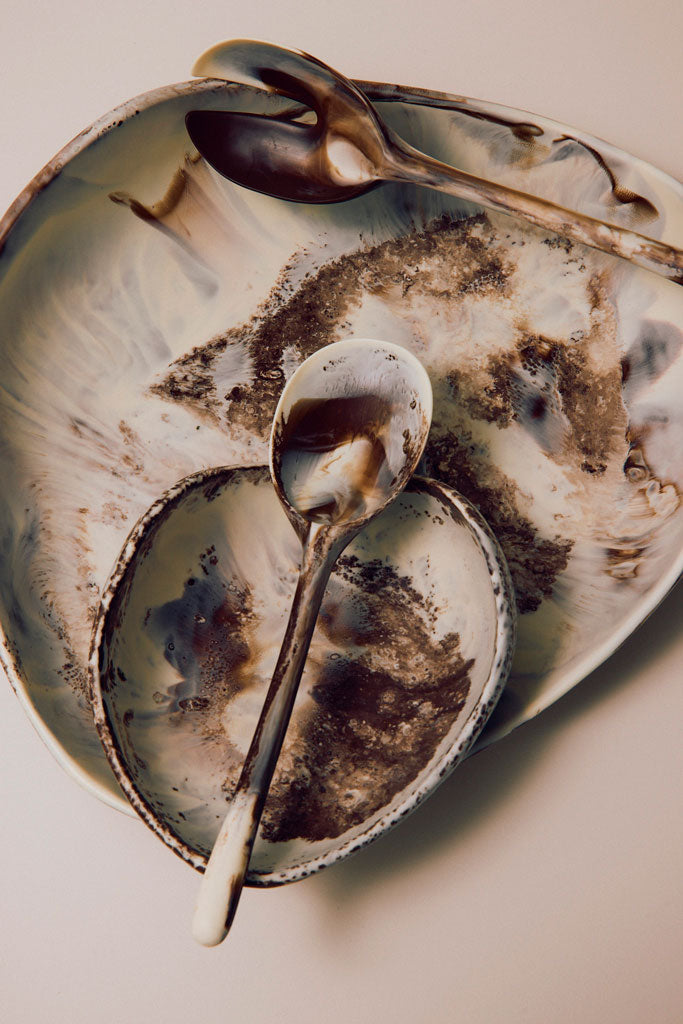 Our homewares are suitable for cold food only. These pieces should be hand washed in warm water. Resin may appear frosted after washing and should be rubbed with a drop of cooking oil to restore sheen. All resin pieces are strong and durable but should be treated like a ceramic and are not shock-absorbent and can break if dropped or knocked against a hard surface. Resin is not fire resistant and so should not be used in an oven, a microwave, or used as candleholders or ashtrays.
