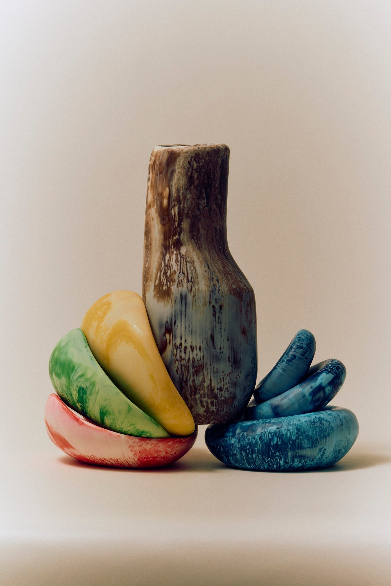 The Studio Vases draw inspiration from within the artist’s studio, tracing the light that falls across objects in the space. Rendered in textural resin castings, each piece is a study in curvilinear forms, characterised by their elongated neck and flared base.