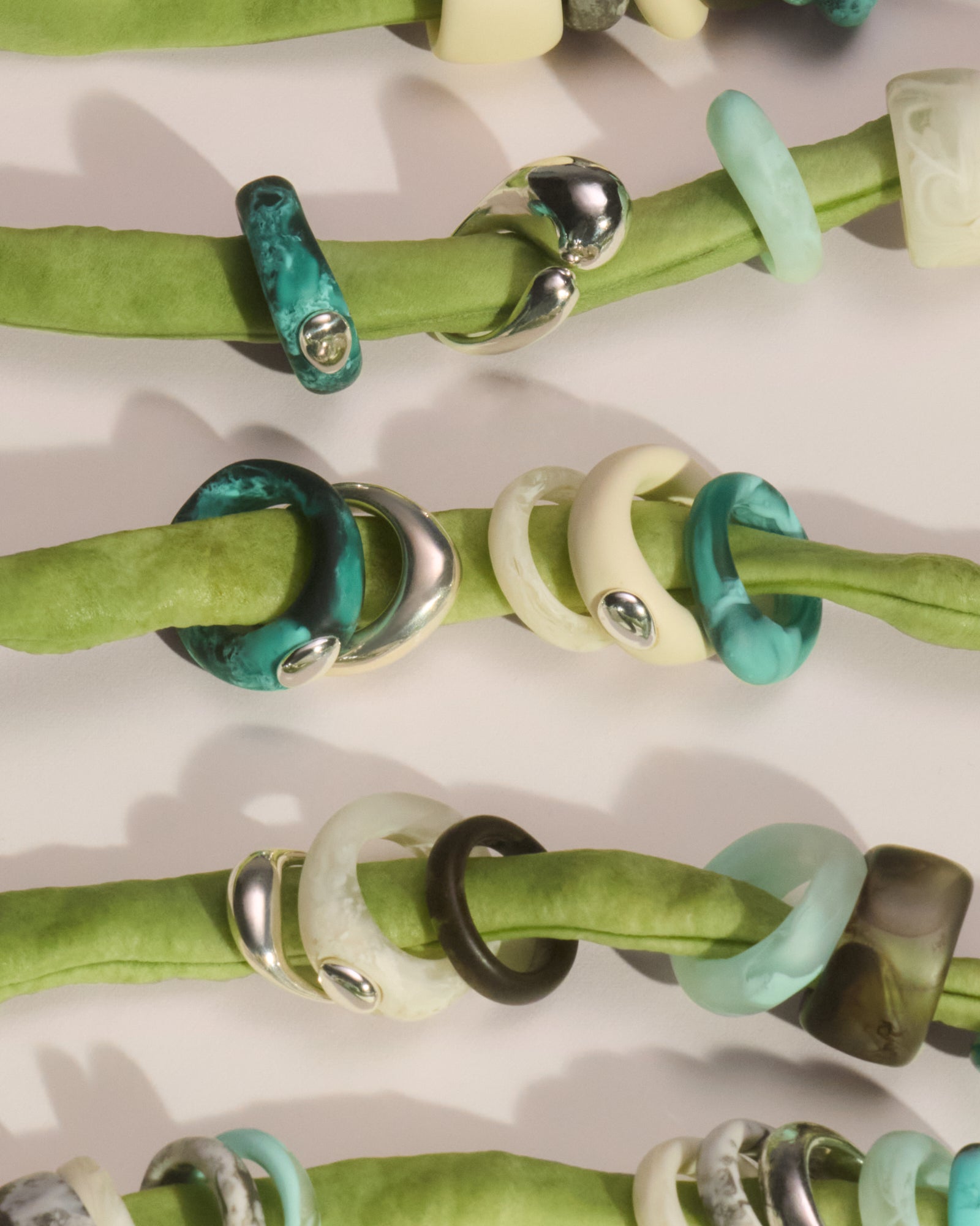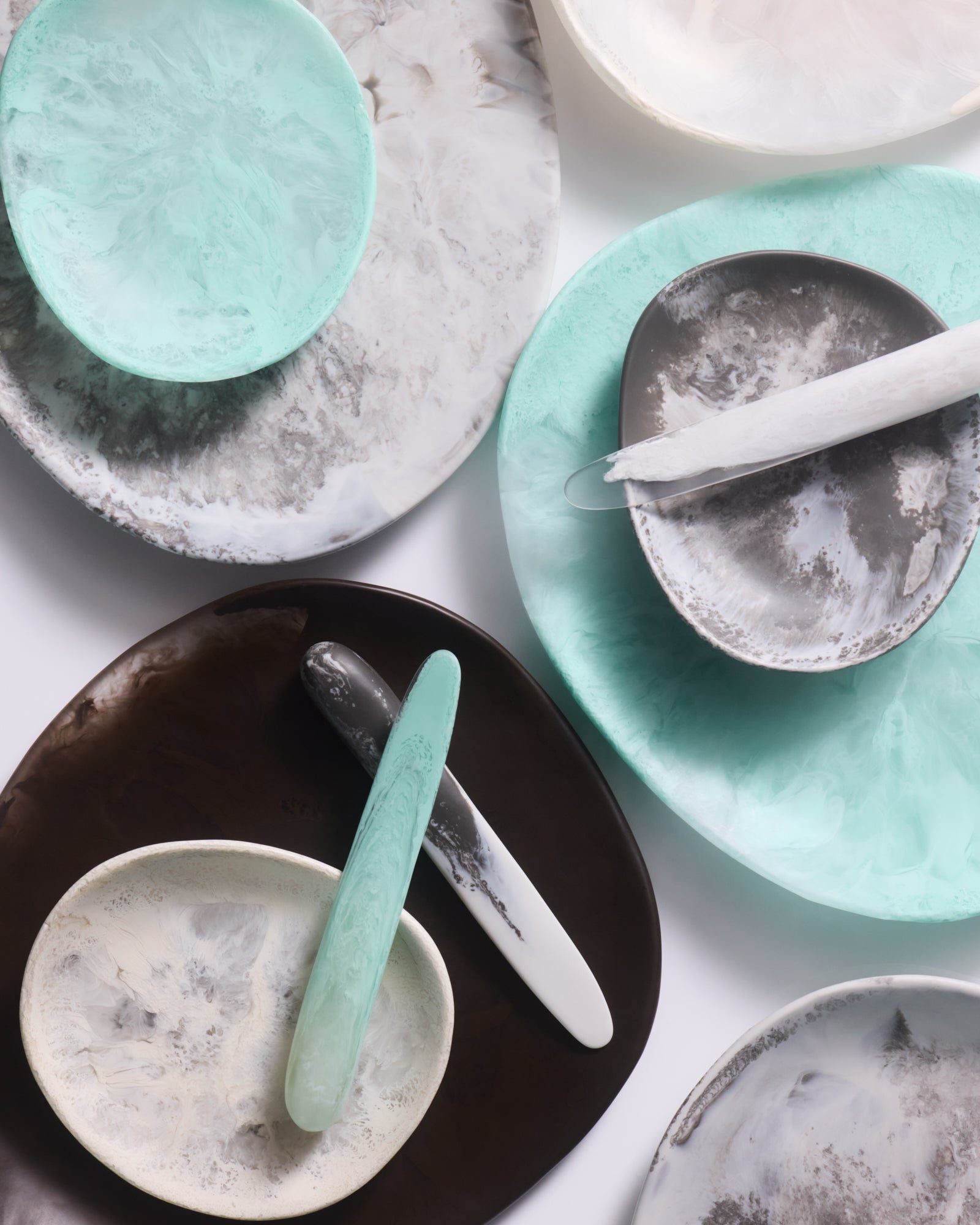 With color and texture as the inspiration, Lichen features handmade resin homewares and jewelry showcasing an earthy palette accentuated by polished silver and tonal glass. Alongside classic Dinosaur Designs colors of Cream, Chalk Swirl, Mint and Granite, the collection introduces two new colors, Lichen, a deep swirled teal, and Cocoa, a subtle earthy brown that grounds the collection’s lighter tones.