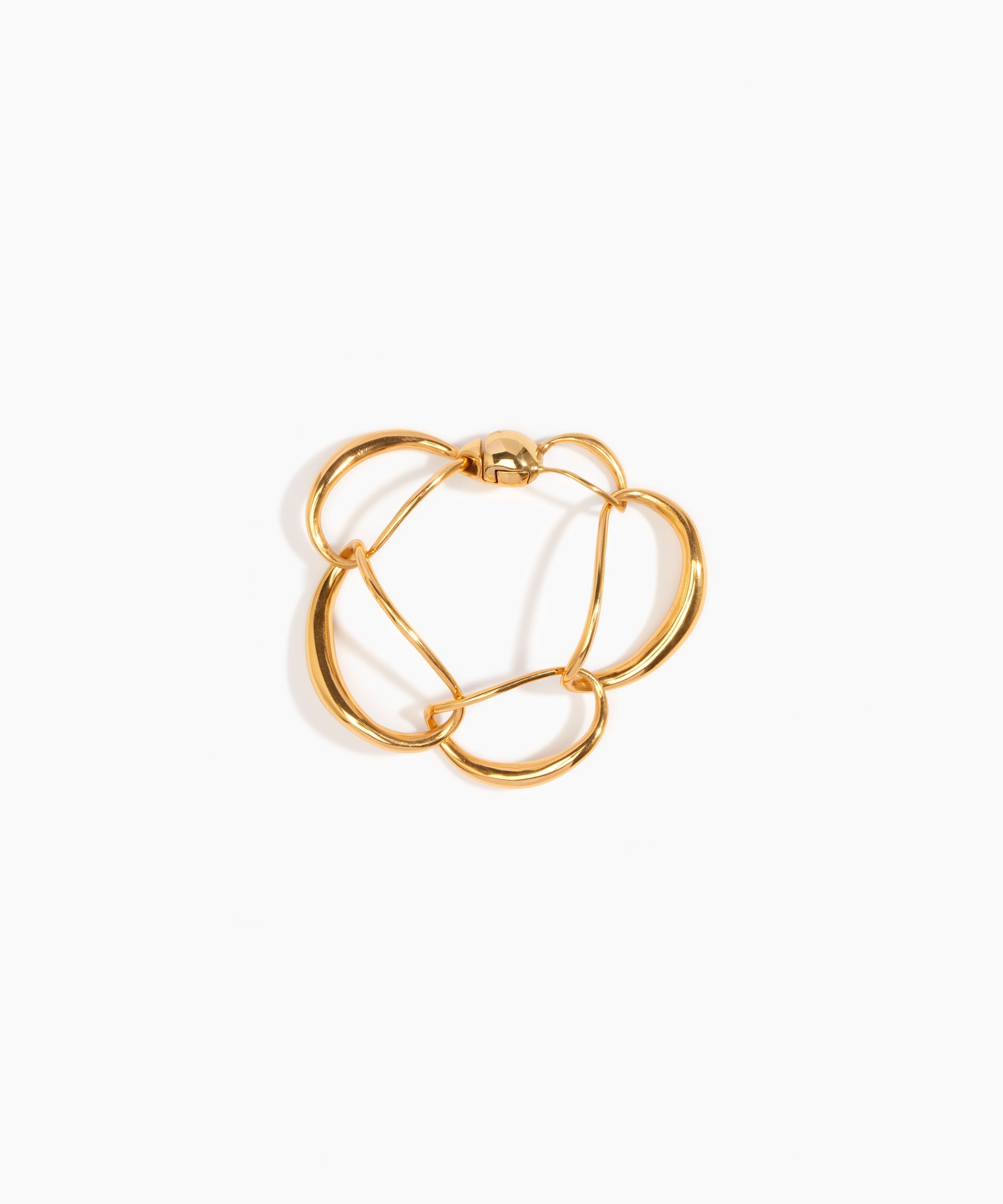 The Liquid Chain Bracelet, by Louise Olsen, achieves a delicate balance of boldness and sensitivity. Secured with a magnetic snap closure. Available in 24K Gold-Plated Brass, and 925 Sterling Silver.